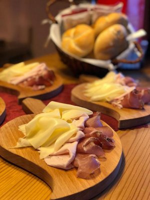 lehká večeře s talířem uzenin a sýrů s místním tradičním žitným